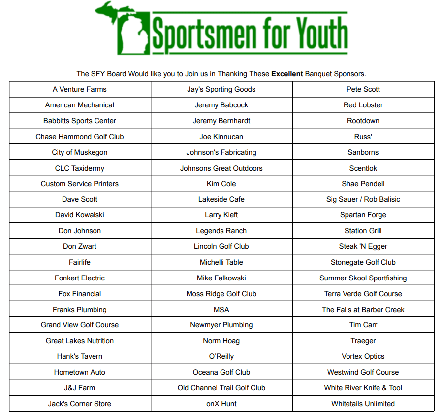 Each year the Sportsmen for Youth board hosts a fundraising banquet which is a fun filled evening to raise the $90,000 dollars necessary to put on the upcoming Youth Day. The banquet at Whitlows Forerunner Restaurant and includes an all you can eat dinner of perch, chicken, and shrimp with all the fixings. The banquet also includes many different raffles such as: firearm raffles, table raffles, live auction, just to name a few. Please come out and donate or participate in our fundraisers. As always, we so very much appreciate any and all contributions that you are able to make to our organization and the mission of getting youth involved in the outdoors.